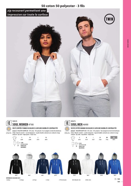 QUALITÉ - MOLLETON GRATTÉ 280 - 50% coton - 50% polyester - Bas et poignets en bord côte élasthanne STYLE - Manches montées - 2 poches kangourou - Capuche doublée contrastée avec cordon de serrage contrasté - Zip caché - Coupe droite - Coupé cousu