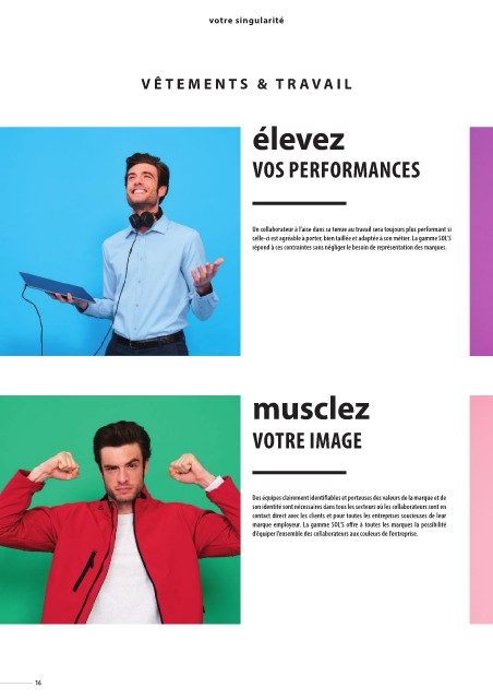 Un collaborateur à l’aise dans sa tenue au travail sera toujours plus performant si celle-ci est agréable à porter, bien taillée et adaptée à son métier. La gamme SOL’S répond à ces contraintes sans négliger le besoin de représentation des marques.