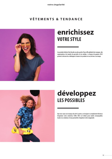 Que vous soyez une marque de prêt-à-porter, un designer ou simplement désireux d’exprimer votre créativité, l’offre SOL’S est idéale pour rendre remarquables toutes vos créations et vous permettre d’exprimer votre singularité.