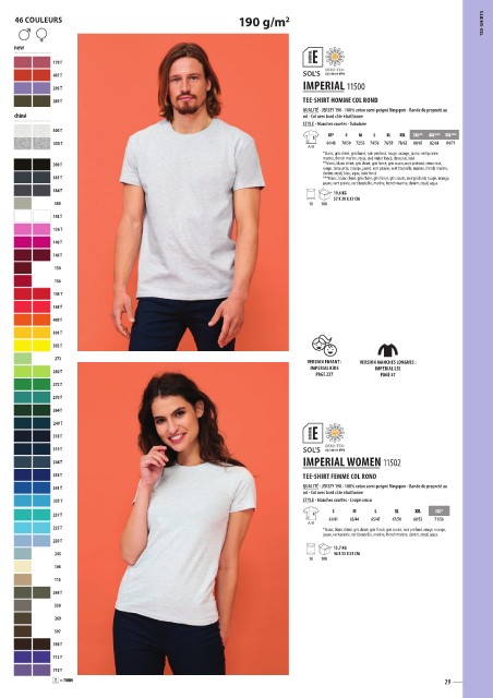 *blanc, blanc chiné, gris chiné, gris foncé, gris souris, noir profond, rouge, orange, jaune, vert prairie, vert bouteille, marine, french marine, denim, royal, aqua.