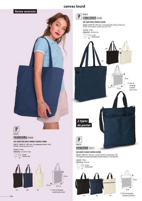 QUALITÉ - CANVAS 420 - 100% coton - 2 poches frontales avec empiècement simili cuir - Poignée de transport et bandoulière ajustable contrastée - 1 poche intérieure