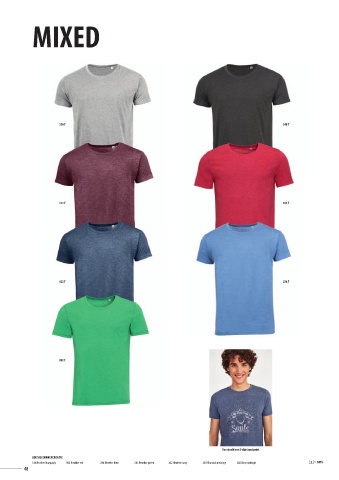 MIXED 350 T 348 T 144 T 163 T 322 T 236 T 262 T Voorbeeld van T-shirt met print SOL’S KLEURREFERENTIE 144 Heather burgundy 163 Heather red 236 Heather blue 262 Heather green 322 Heather navy 348 Charcoal melange 350 Grey melange 48